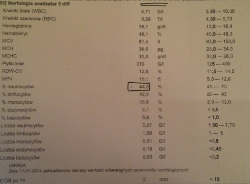 Czy mogę prosić o intepretację wyniku morfologii? Neutrocyty liczbowo w normie, ale procentowo 44%, podczas gdy obecna norma wynosi 45-70%:
